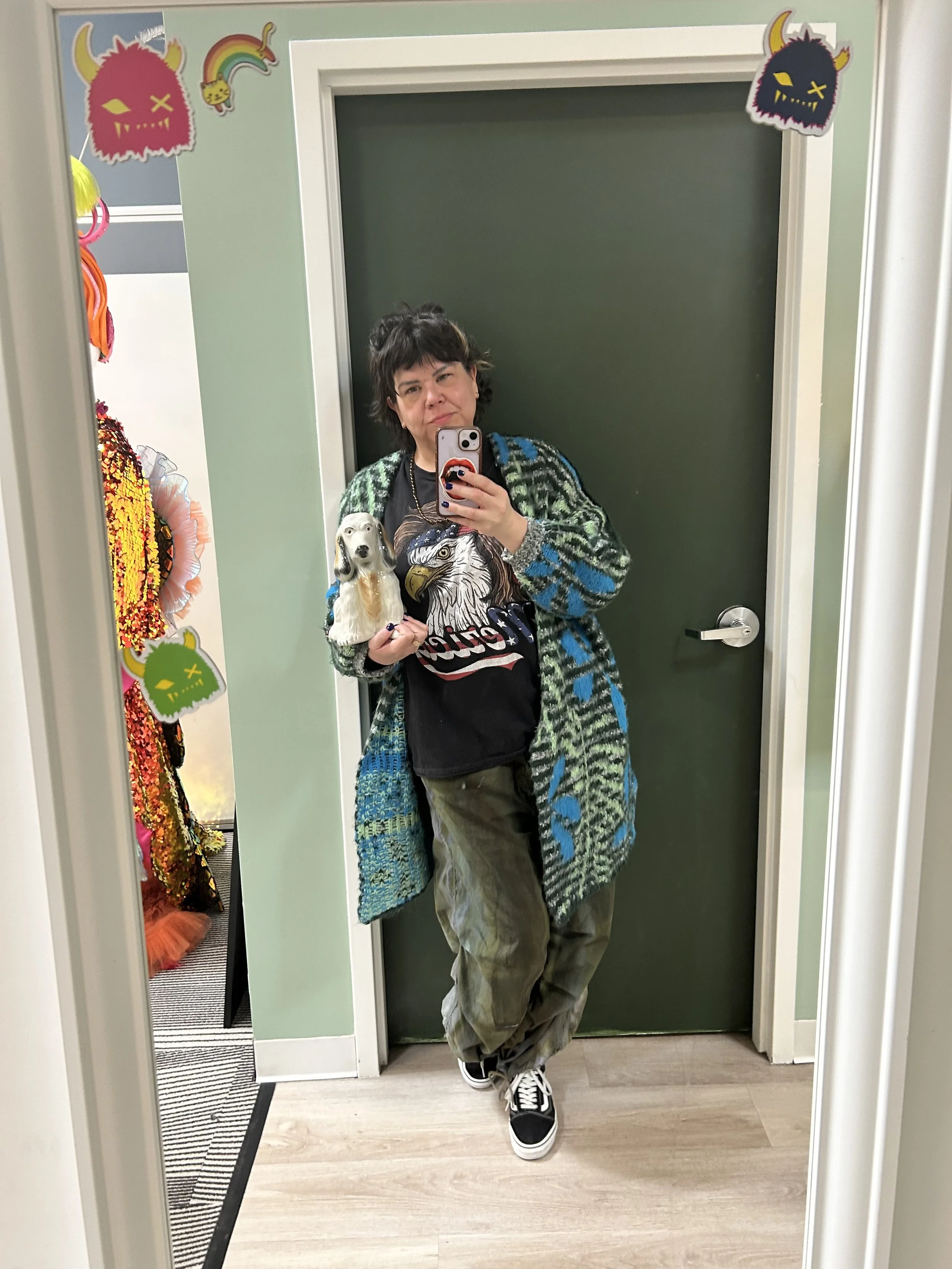 Maryn: “The pants and sweater are Free People. The sweater is like a warm hug and calming in the perfect blend of blue and green knit. The pants caught my attention because of the unique dye technique. The blend of greens almost gives texture and intrigue in a basic piece. The tee is a quiet, understated commentary on the current state of our government. It has quickly become a staple and favorite of mine. It’s perfectly broken, soft, and comfortable. The dog statue was a gift from Gaby (booth 8). The human-like qualities in the eyes are what draw me in. I named him Gary because he reminds me of my dad.”